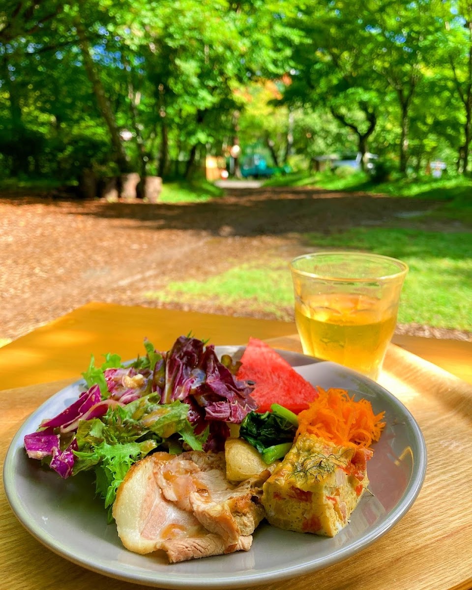 For lunch, the cafe serves an exquisite サラダプレート that features a refreshing leaf salad accompanied by four delectable daily delicacies and freshly baked bread—all for just JP¥1,000. Each dish beautifully highlights locally sourced organic ingredients, ensuring that you relish not just the taste but also the essence of the surrounding nature.